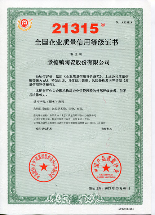 景德鎮陶瓷股份公司再次榮獲“全國企業質量信用等級AAA級證書”