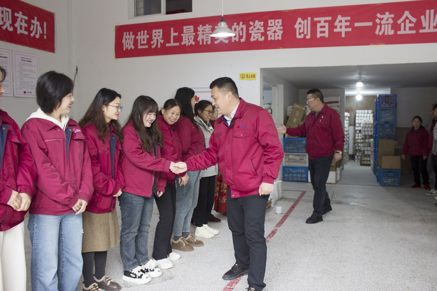 在金品陶公司、紅葉公司一廠、三廠、研究所和窯具廠,領導們與夾道歡迎的員工致以新春祝福。希望生產口在提質增效上要有新擔當。
